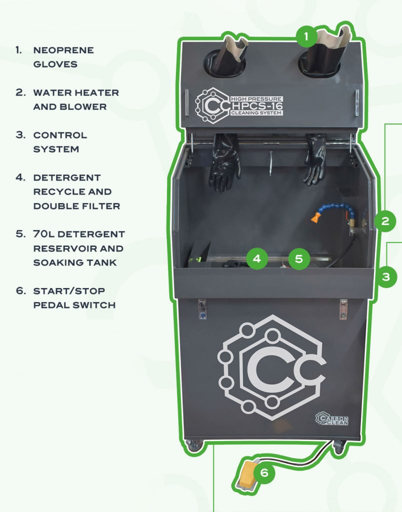 The Carbon Clean High Pressure Cleaning System is the very latest evolution in parts washing technology. An effective and compact machine with a fully contained stainless steel cleaning area and using simplyhigh pressure air and water to remove grease, grime and carbon build up from all manner of parts.